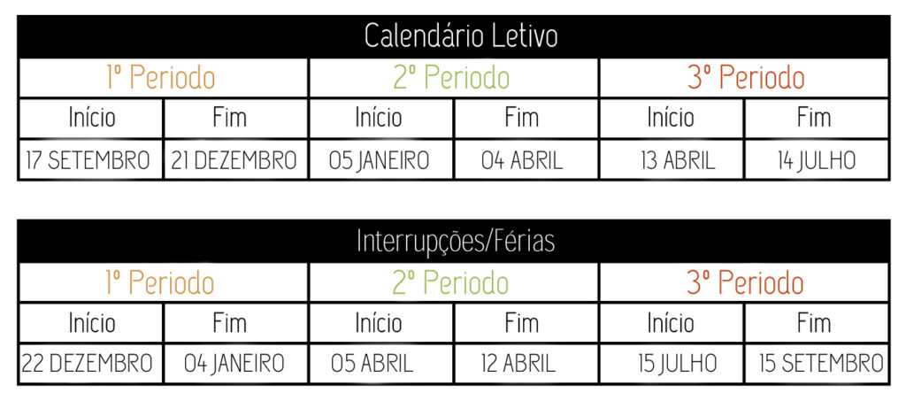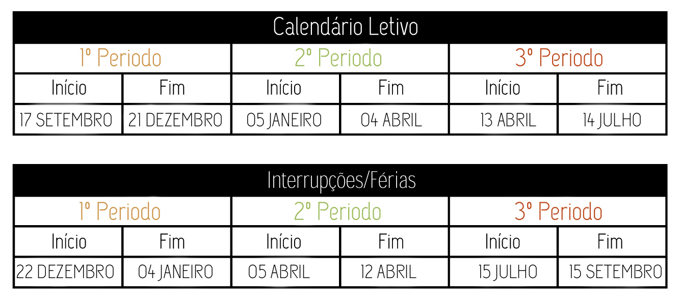 Calendário ANO LETIVO 2025/2026 As atividades extra curriculares (workshops, masterclass, residências, apresentações e outras atividades) serão realizadas nas interrupções letivas.