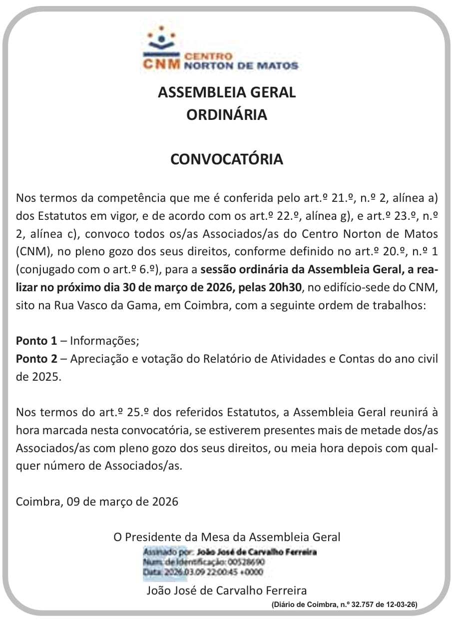 View Larger Image Convocatória – Assembleia Geral – Março 2026 Assembleia Geral, a reunir em sessão ordinária, no próximo dia 30 de março, pelas 20h30. eduardo2026-03-12T15:19:23+00:00
